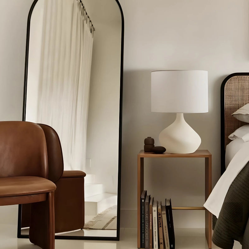 The Ahra Minimalist Table Lamp is a quiet statement of form and light. Its fluid ceramic base, inspired by Japanese pottery, carries a graceful, asymmetric silhouette. Topped with a soft linen drum shade, it casts a warm, diffused glow—perfect beside a bed, reading nook, or living room console.