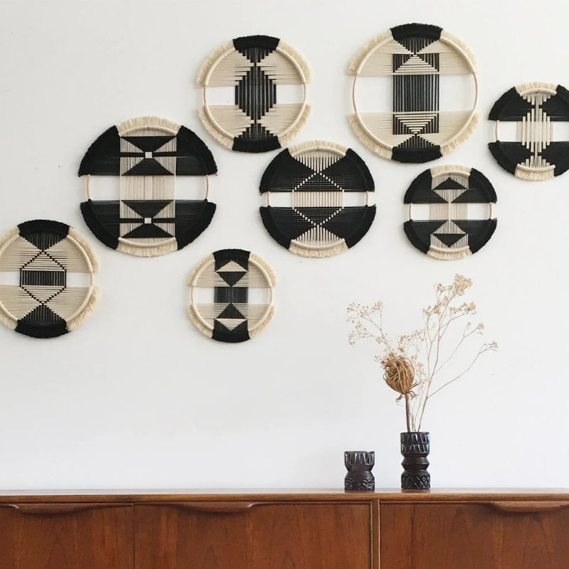 Bold yet balanced, the Safiya decorative wall art is handwoven from natural cotton, merging clean geometry with tactile softness. Its striking black and ivory palette evokes quiet strength, while the circular form softens and grounds the piece.